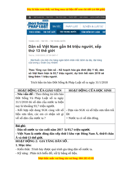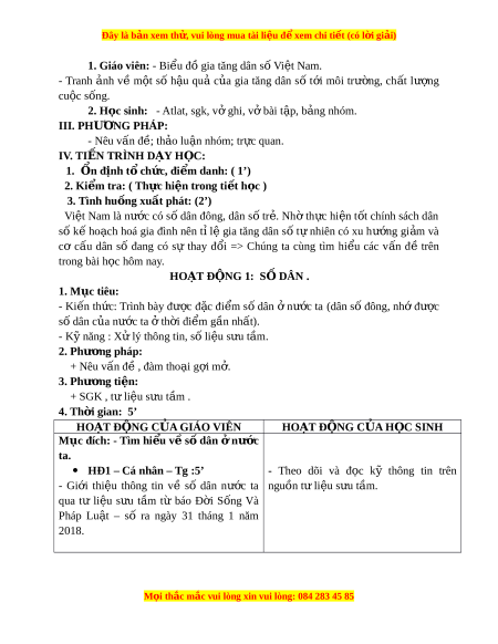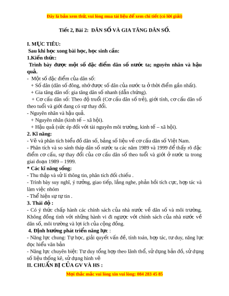 Đây là bản xem th , vu ử i lòng mua tài li u ệ đ xe ể m chi ti t (c ế ó l i ờ gi i ả ) 1. Giáo viên: - Bi u ể đồ gia tăng dân s ố Vi t ệ Nam. - Tranh nh ả về m t ộ số h u ậ quả c a ủ gia tăng dân số t i ớ môi trư ng, ờ ch t ấ lư ng ợ cu c ộ sống. 2. H c