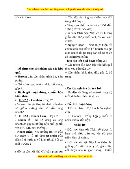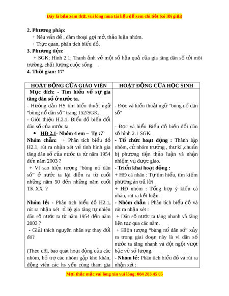 Đây là bản xem th , vu ử i lòng mua tài li u ệ đ xe ể m chi ti t (c ế ó l i ờ gi i ả ) 2. Phư ng ơ pháp: + Nêu v n đ ấ , đàm ề tho i ạ g i ợ m , t ở h o ả lu n ậ nhóm. + Tr c quan, phân ự tích bi u ể đ . ồ 3. Phư ng ơ ti n: ệ + SGK; Hình 2.1; Tranh nh ả về m t ộ số h u ậ quả c a ủ gia tăng dân số t i ớ môi trư ng, ch ờ ất lư ng cu ợ c ộ s ng. ố . 4. Th i ờ gian: 17’ HOẠT Đ N Ộ G C A Ủ GIÁO VIÊN HOẠT Đ N Ộ G C A Ủ H C Ọ SINH
