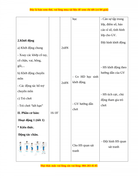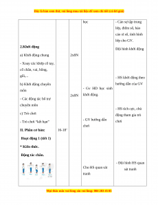 học - Cán sự tập trung lớp, điểm số, báo cáo sĩ số, tình hình lớp cho GV. 2.Khởi động Đội hình khởi động a) Khởi động chung 2x8N - Xoay các khớp cổ tay, cổ chân, vai, hông, gối,... - HS khởi động theo b) Khởi động chuyên hướng dẫn của GV - Gv HD học sinh môn 2x8N khởi động.