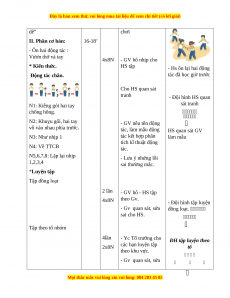 Phương pháp, tổ chức và yêu cầu Nội dung Thời Số Hoạt động GV Hoạt động HS gian lượng I. Phần mở đầu 5 – 7’ 1.Nhận lớp Gv nhận lớp, thăm Đội hình nhận lớp hỏi sức khỏe học sinh phổ biến nội dung, yêu cầu giờ học - Cán sự tập trung lớp, điểm số, báo cáo sĩ số, tình hình lớp cho GV. 2.Khởi động a) Khởi động chung 2x8N Đội hình khởi động - Xoay các khớp cổ tay, cổ chân, vai, hông, gối,... b) Khởi động chuyên