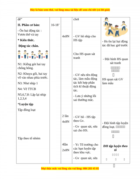 dê” chơi II. Phần cơ bản: 16-18’ - Ôn hai động tác : Vươn thở và tay 4x8N - GV hô nhịp cho * Kiến thức. HS tập - Hs ôn lại hai động Động tác chân. tác đã học giờ trước Cho HS quan sát tranh - Đội hình HS quan N1: Kiễng gót hai tay sát tranh chống hông. N2: Khuỵu gối, hai tay - GV nêu tên động vỗ vào nhau phía trước. tác, làm mẫu động HS quan sát GV N3: Như nhịp 1 tác kết hợp phân làm mẫu tích kĩ thuật động N4: Về TTCB tác. N5,6,7,8: Lặp lại nhịp - Lưu ý nhứng lỗi 1,2,3,4 sai thường mắc. *Luyện tập Tập đồng loạt 2 lần - GV hô - HS tập 4x8N theo Gv. - Đội hình tập luyện - Gv quan sát, sửa đồng loạt. sai cho HS. Tập theo tổ nhóm 4lần - Yc Tổ trưởng cho