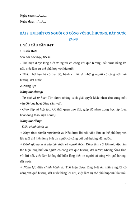BÀI 2: EM BIẾT ƠN NGƯỜI CÓ CÔNG VỚI QUÊ HƯƠNG, ĐẤT NƯỚC (3 tiết)