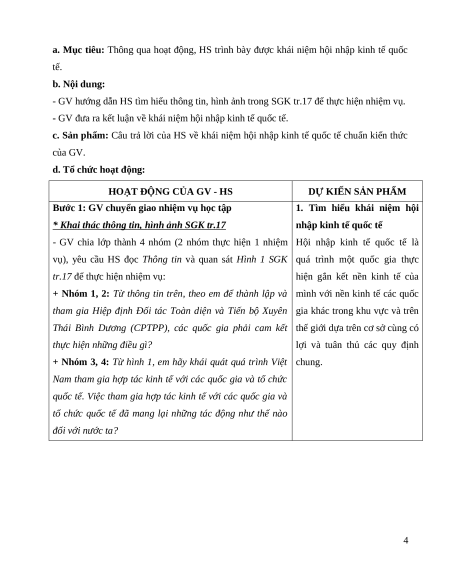 - GV chia lớp thành 4 nhóm (2 nhóm thực hiện 1 nhiệm Hội nhập kinh tế quốc tế là