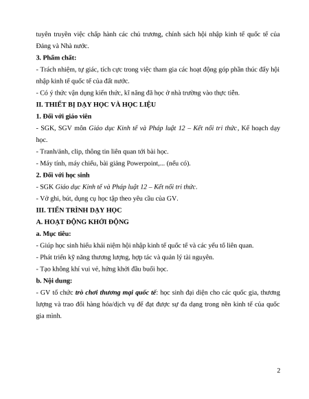 Giáo án Bài 2: Hội nhập kinh tế quốc tế KTPL 12 Kết nối tri thức