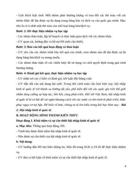 - GV đưa ra kết luận về khái niệm và sự cần thiết hội nhập kinh tế quốc tế. 4