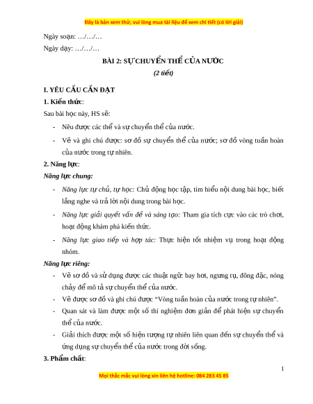 Ngày so n ạ : …/…/… Ngày d y ạ : …/…/… BÀI 2: S Ự CHUYỂN TH Ể C A Ủ NƯỚC (2 ti t ế ) I. YÊU CẦU C N Ầ Đ T Ạ 1. Ki n ế th c ứ : Sau bài h c ọ này, HS s : ẽ - Nêu đ c ượ các th ể và s ự chuy n ể th ể c a ủ n c. ướ - Vẽ và ghi chú đ c ượ : sơ đồ sự chuy n ể thể c a ủ n c; ướ sơ đồ vòng tu n ầ hoàn c a ủ n c ướ trong t ự nhiên. 2. Năng l c ự : Năng l c ự chung: - Năng l c ự tự ch , ủ tự h c ọ : Chủ đ n ộ g h c ọ t p ậ , tìm hi u ể n i ộ dung bài h c, ọ bi t ế l n ắ g nghe và tr ả l i ờ n i ộ dung trong bài h c. ọ - Năng l c ự gi i ả quy t ế v n ấ đề và sáng t o