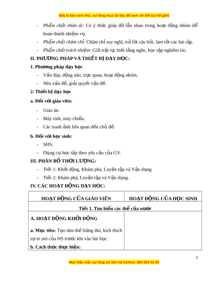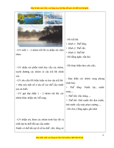 II. PHƯƠNG PHÁP VÀ THI T Ế B Ị D Y Ạ H C Ọ : 1. Phư ng ơ pháp d y ạ h c ọ - Vấn đáp, đ n ộ g não, tr c ự quan, ho t ạ đ n ộ g nhóm. - Nêu v n ấ đ , ề gi i ả quy t ế v n ấ đ . ề 2. Thi t ế b ị d y ạ h c ọ a. Đ i ố v i ớ giáo viên: - Giáo án. - Máy tính, máy chi u ế . - Các tranh n ả h liên quan đ n ế ch ủ đ . ề b. Đ i ố v i ớ h c ọ sinh: - SHS. - D n ụ g c ụ h c ọ t p ậ theo yêu c u ầ c a ủ GV. III. PHÂN B Ố TH I Ờ LƯ N Ợ G: - Ti t ế 1: Kh i ở đ n ộ g, Khám phá, Luy n ệ t p ậ và V n ậ d n ụ g - Ti t ế 2: Khám phá, Luy n ệ t p ậ và V n ậ d n ụ g. IV. CÁC HO T Ạ Đ N Ộ G D Y Ạ H C Ọ : HOẠT ĐỘNG C A Ủ GIÁO VIÊN HO T Ạ ĐỘNG C A Ủ H C Ọ SINH Tiết 1. Tìm hi u ể các th ể c a ủ nư c ớ A. HO T Ạ Đ N Ộ G KH I Ở Đ N Ộ G a. M c ụ tiêu: T o ạ tâm th ế h n ứ g thú, kích thích s ự tò mò c a ủ HS tr c ướ khi vào bài h c. ọ b. Cách th c ứ th c ự hi n: ệ 2