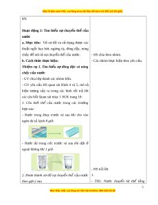 ạ : Tham gia tích c c ự vào các trò ch i ơ , ho t ạ đ n ộ g khám phá ki n ế th c ứ . - Năng l c ự giao ti p ế và h p ợ tác: Th c ự hi n ệ t t ố nhi m ệ vụ trong ho t ạ đ n ộ g nhóm. Năng l c ự riêng: - Vẽ sơ đồ và sử d n ụ g đ c ượ các thu t ậ ng : ữ bay h i ơ , ng n ư g t , ụ đông đ c ặ , nóng ch y ả đ ể mô t ả s ự chuy n ể th ể c a ủ n c. ướ - Vẽ đ c ượ s ơ đồ và ghi chú đ c ượ “Vòng tu n ầ hoàn c a ủ n c ướ trong t ự nhiên”. - Quan sát và làm đ c ượ m t ộ số thí nghi m ệ đ n ơ gi n ả để phát hi n ệ sự chuy n ể th ể c a ủ n c ướ . - Gi i ả thích đ c ượ m t ộ số hi n ệ t n