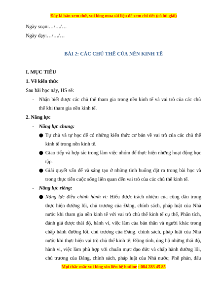 Giáo án Bài 2 KTPL 10 Kết nối tri thức: Các chủ thể của nền kinh tế