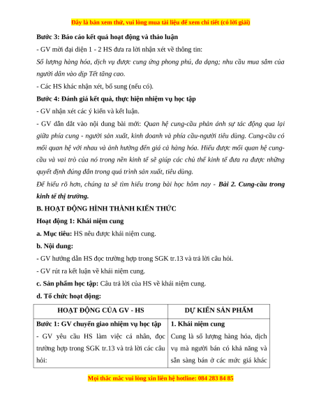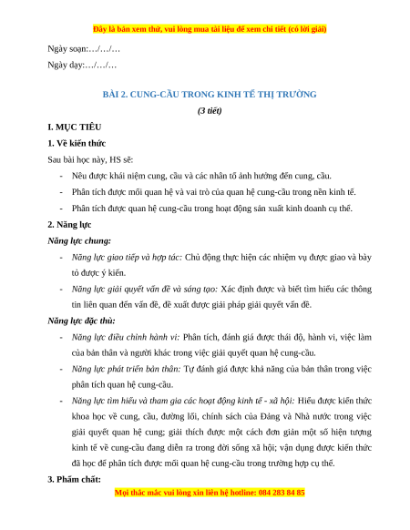 BÀI 2. CUNG-CẦU TRONG KINH TẾ THỊ TRƯỜNG (3 tiết) I. MỤC TIÊU 1. Về kiến thức Sau bài học này, HS sẽ: