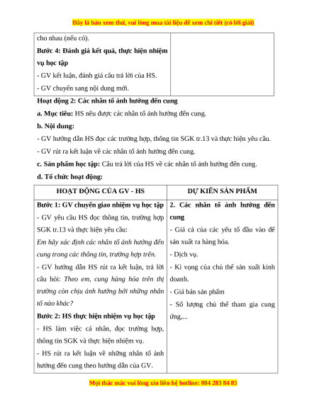 Hoạt động 2: Các nhân tố ảnh hưởng đến cung