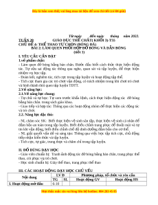 ằ bàn chân. trong sách giáo khoa. - Giao ti p ế và h p ợ tác: Thông qua các ho t ạ đ ng ộ nhóm đ t ể h c ự hi n ệ các đ ng ộ tác và trò ch i ơ . 2.2. Năng l c đ ự c t ặ hù: - NL chăm sóc SK: Bi t ế th c ự hi n ệ v ệ sinh sân t p, ậ th c ự hi n ệ v ệ sinh cá nhân để đ m ả b o ả an toàn trong t p ậ luy n. ệ Bi t ế đi u ề ch nh ỉ trang ph c ụ đ ể tho i ả mái và tự tin khi v n ậ đ ng, bi ộ t ế đi u ch ề nh ch ỉ đ ế di ộ nh dư ng ỡ đ m ả b o ả cho c t ơ h . ể - NL gi i ả quy t ế v n ấ dề và sáng t o: ạ Thông qua vi c ệ h c ọ t p ậ tích c c, ự ch ủ đ ng ộ ti p nh ế n ậ ki n t ế h c và t ứ p ậ luy n. ệ - Tích c c, t ự ự giác, trung th c ự và chăm ch t ỉ rong t p ậ luy n. ệ II. Đ D Ồ ÙNG D Y Ạ H C Ọ - Giáo viên chu n b ẩ : ị Tranh nh ả đ ng ộ tác đ bóng b ỡ ng ằ bàn chân, trang ph c ụ thể thao, còi ph c ụ v t ụ rò ch i ơ . - H c s ọ inh chu n b ẩ :