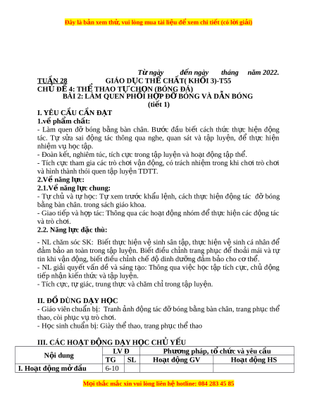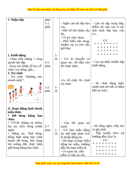 Đây là bản xem th , vu ử i lòng mua tài li u ệ đ xe ể m chi ti t (c ế ó l i ờ gi i ả ) 1. Nhận l p ớ phút 1-2 - Nghe cán bộ l p ớ báo - Cán sư t p ậ trung l p, ớ phút cáo. đi m ể số, báo cáo sĩ s , ố - H i ỏ v s ề c ứ kh e c ỏ a ủ tình hình l p ớ h c ọ cho Hs. Gv. - Cô trò chúc nhau. - Phổ bi n ế n i ộ dung, GV nhi m ệ vụ và yêu c u ầ * * * * * * * * gi h ờ c. ọ * * * * * * * * * * * * * * 2. Kh i ở đ ng ộ 1- * * * * * * * - Ch y ạ nhẹ nhàng 1 vòng 2L - GV di chuy n ể và quanh sân t p. ậ 3-5 quan sát, chỉ d n ẫ cho - Cán sự đi u ề khi n ể l p ớ - Xoay các kh p c ớ ổ tay, cổ phút HS th c hi ự n. ệ kh i ở đ ng . ộ chân, vai, hông, gối,... 3. Trò ch i ơ . - Trò ch i ơ “Đư ng ờ nào nhanh nh t ấ ”. -Gv tổ ch c ứ Hs ch i ơ trò ch i ơ . - Hs ch i ơ đúng lu t ậ , 1-2 1- nhi t ệ tình sôi n i ổ và đ m ả phút 2L b o an t ả oàn. II. Hoạt đ ng ộ hình thành ki n t ế h c. ứ * Đỡ bóng b ng ằ bàn chân. + TTCB: Đ ng ứ tự nhiên, - Cho HS quan sát hai tay c m ầ bóng trư c ớ 5-7 tranh - Hs l ng ắ nghe, ti p ế thu ng c. ự phút 1- - GV làm m u ẫ đ ng ộ và ghi nh . ớ + Đ ng ộ tác: Thả bóng, 2L tác k t ế h p ợ phân tích - T p ậ luy n ệ theo sự đồng th i ờ nâng bàn chân kĩ thu t ậ đ ng t ộ ác. hư ng d ớ ẫn c a G ủ v. thu n ậ đỡ bóng. Khi bóng - Hô nh p ị và th c ự hi n ệ GV r i ơ xuống đ t ấ , th c ự hi n ệ đ ng ộ tác m u, ẫ hư ng ớ * * * * * * * * gi bóng b ữ ng bàn ằ chân. dẫn Hs th c hi ự ện đt. * * * * * * * - Gv quan sát, uốn * * * * * * * n m ắ và s a ử sai cho * * * * * * * M i