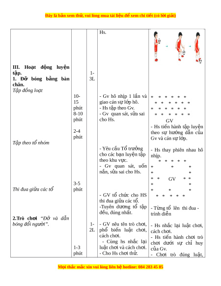Đây là bản xem th , vu ử i lòng mua tài li u ệ đ xe ể m chi ti t (c ế ó l i ờ gi i ả ) Hs. III. Hoạt đ ng ộ luy n ệ tập. 1- 1. Đỡ bóng b ng ằ bàn 3L chân. T p đ ậ ồng lo t ạ 10- - Gv hô nh p ị 1 l n ầ và * * * * * * 15 giao cán sự l p hô. ớ * * * * * * phút - Hs t p t ậ heo Gv. * * * * * * 8-10 - Gv quan sát, s a ử sai * * * * * * phút cho Hs. GV - Hs ti n ế hành t p ậ luy n ệ 2-4 theo sự hư ng ớ d n ẫ c a ủ phút Gv và cán sự l p ớ . T p t ậ heo tổ nhóm - Yêu cầu Tổ trư ng ở - Hs thay phiên nhau hô cho các b n ạ luy n t ệ p ậ nhịp. theo khu v c. ự * * * * * - Gv quan sát, u n ố * * * n n, s ắ a ử sai cho Hs. * * * * GV * * 3-5 * * Thi đua gi a ữ các t ổ phút * * * - GV tổ ch c ứ cho HS * * * * * thi đua gi a các ữ tổ. -Tuyên dư ng ơ tổ t p ậ - T ng t ừ ổ lên thi đua - đ u, đúng nh ề ất. trình di n ễ 2.Trò ch i