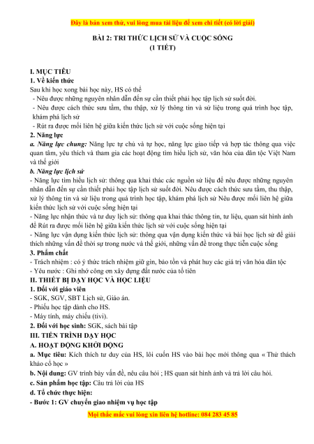 BÀI 2: TRI THỨC LỊCH SỬ VÀ CUỘC SỐNG (1 TIẾT) I. MỤC TIÊU 1. Về kiến thức