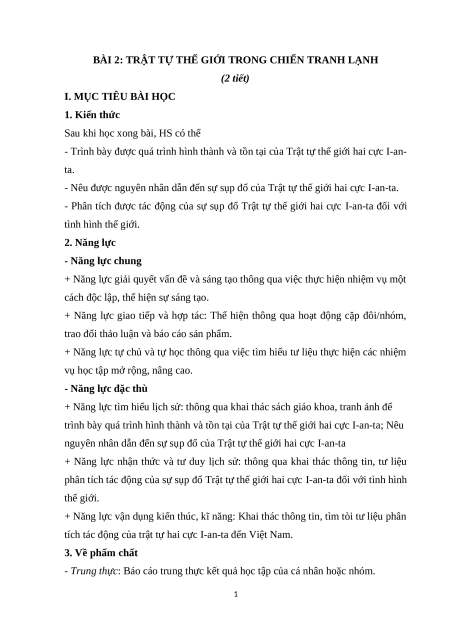 - Phân tích được tác động của sự sụp đổ Trật tự thế giới hai cực I-an-ta đối với tình hình thế giới. 2. Năng lực - Năng lực chung