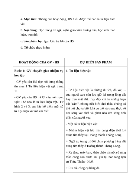 a. Mục tiêu: Thông qua hoạt động, HS hiểu được thế nào là tư liệu hiện vật.
