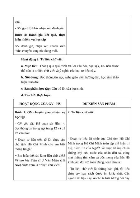 hoạt động thực hành sưu tầm, phân tích và khai thác một số tư liệu lịch sử.