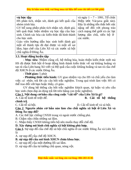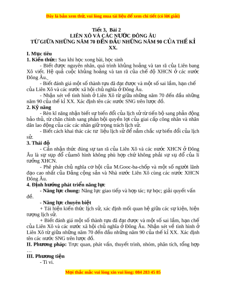 - Phê phán chủ nghĩa cơ h i ộ c a ủ M.Gooc-ba-ch p ố và m t ộ số ngư i ờ lãnh đ o ạ cao nh t ấ c a ủ Đ ng ả c ng ộ s n ả và Nhà nư c ớ Liên Xô cùng các nư c ớ XHCN Đông Âu. 4. Đ nh h ị ư ng phá ớ t tri n năng l ể c ự - Năng l c ự chung: Năng l c gi ự ao ti p và ế h p t ợ ác; t h ự c; ọ gi i ả quy t ế v n ấ đ . ề - Năng l c ự chuyên bi t ệ + Tái hi n ệ ki n ế th c ứ l ch ị sử, xác đ nh ị m i ố quan hệ gi a ữ các s ự ki n, ệ hi n ệ tư ng ợ l ch s ị ử. + Bi t ế đánh giá m t ộ số thành t u ự đã đ t ạ đư c ợ và m t ộ s ố sai l m ầ , h n ạ chế c a ủ Liên Xô và các nư c ớ xã h i ộ ch