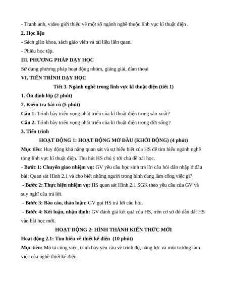 - Tranh ảnh, video giới thiệu về một số ngành nghề thuộc lĩnh vực kĩ thuật điện . 2. Học liệu