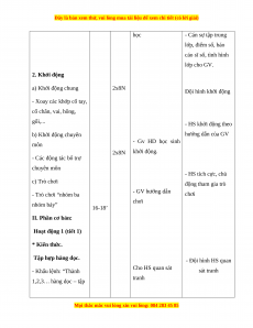 học - Cán sự tập trung lớp, điểm số, báo cáo sĩ số, tình hình lớp cho GV. 2. Khởi động a) Khởi động chung 2x8N Đội hình khởi động - Xoay các khớp cổ tay, cổ chân, vai, hông, gối,... - HS khởi động theo b) Khởi động chuyên hướng dẫn của GV - Gv HD học sinh môn 2x8N khởi động.