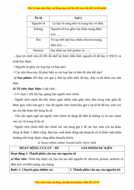 - Qua trò chơi vừa rồi HS đã nhớ lại được kiến thức nguyên tử đã học ở THCS và trình bày được: