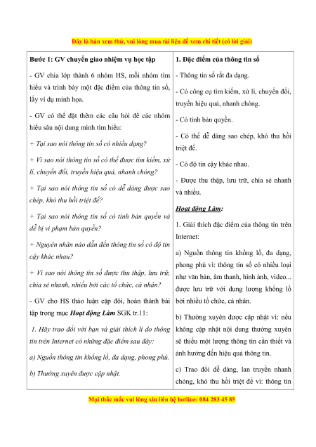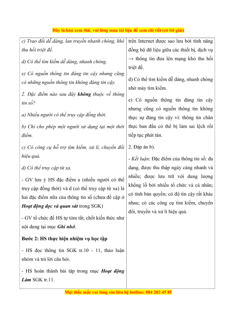 Hoạt động 1: Tìm hiểu đặc điểm của thông tin số