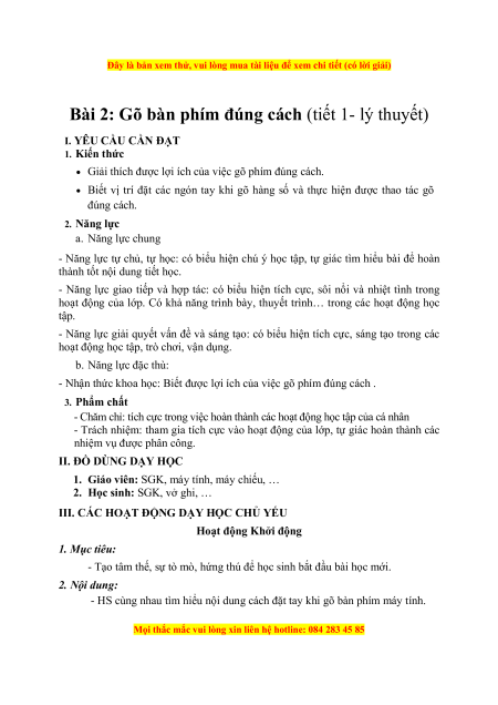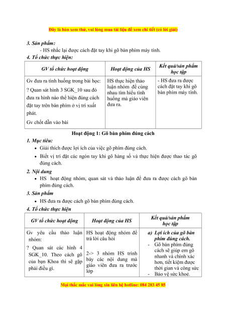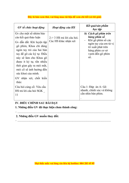 Đây là bản xem thử, vui lòng mua tài liệu để xem chi tiết (có lời giải) Kết quả/sản phẩm GV tổ chức hoạt động Hoạt động của HS học tập Gv cho một số nhóm báo b) Cách gõ phím trên