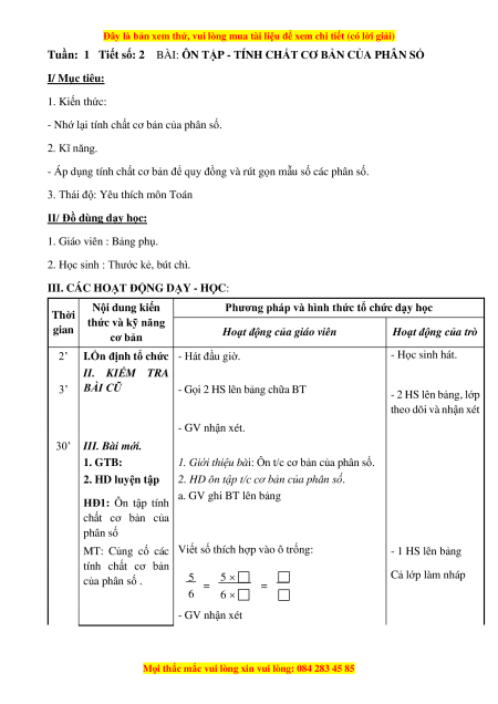 Tuần: 1 Tiết số: 2 BÀI: ÔN TẬP - TÍNH CHẤT CƠ BẢN CỦA PHÂN SỐ I/ Mục tiêu: 1. Kiến thức: