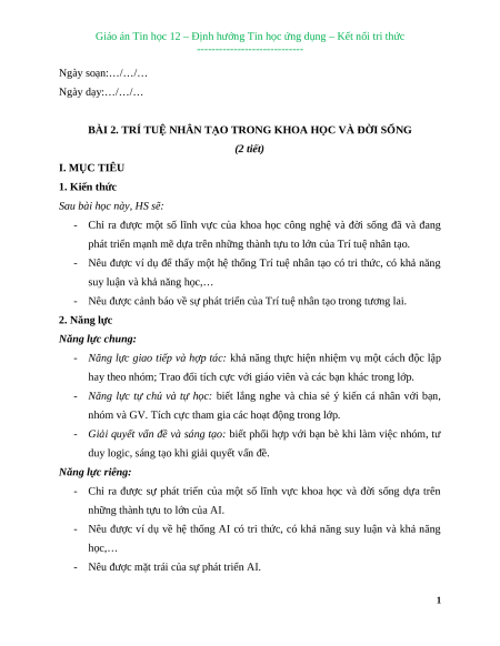 BÀI 2. TRÍ TUỆ NHÂN TẠO TRONG KHOA HỌC VÀ ĐỜI SỐNG (2 tiết) I. MỤC TIÊU 1. Kiến thức