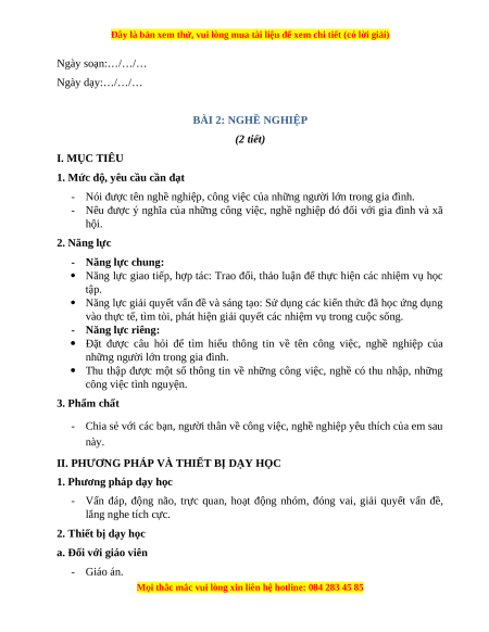 Ngày soạn:…/…/… Ngày dạy:…/…/… BÀI 2: NGHỀ NGHIỆP (2 tiết) I. MỤC TIÊU