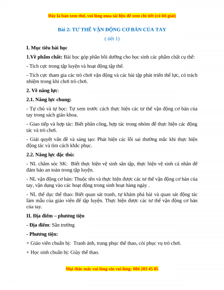 Giáo án Bài 2: Tư thế vận động cơ bản của tay Giáo dục thể chất lớp 1 Chân trời sáng tạo
