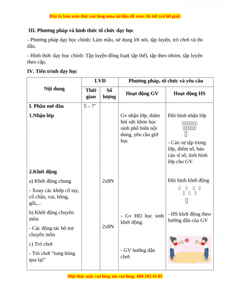 - Phương pháp dạy học chính: Làm mẫu, sử dụng lời nói, tập luyện, trò chơi và thi đấu.