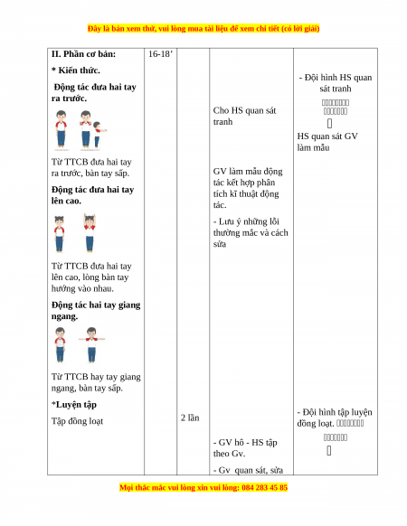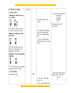 Động tác đưa hai tay tích kĩ thuật động lên cao. tác. - Lưu ý những lỗi thường mắc và cách sửa Từ TTCB đưa hai tay lên cao, lòng bàn tay hướng vào nhau. Động tác hai tay giang ngang. Từ TTCB hay tay giang ngang, bàn tay sấp. *Luyện tập - Đội hình tập luyện Tập đồng loạt 2 lần đồng loạt. - GV hô - HS tập theo Gv. - Gv quan sát, sửa