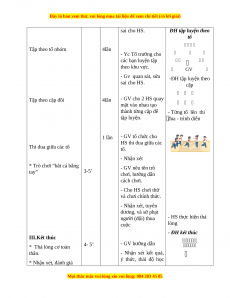 Phương pháp, tổ chức và yêu cầu Nội dung Thời Số Hoạt động GV Hoạt động HS gian lượng I. Phần mở đầu 5 – 7’ 1.Nhận lớp Gv nhận lớp, thăm Đội hình nhận lớp hỏi sức khỏe học sinh phổ biến nội dung, yêu cầu giờ học - Cán sự tập trung lớp, điểm số, báo cáo sĩ số, tình hình lớp cho GV. 2.Khởi động a) Khởi động chung 2x8N Đội hình khởi động - Xoay các khớp cổ tay, cổ chân, vai, hông, gối,... b) Khởi động chuyên