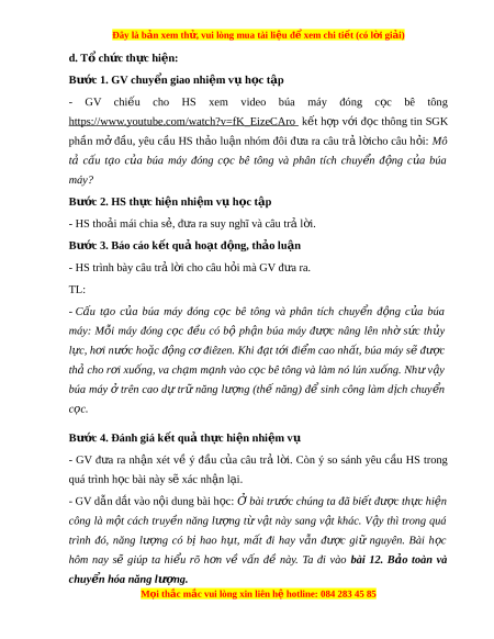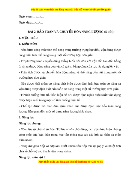 Đây là bản xem th , vu ử i lòng mua tài li u ệ đ xe ể m chi ti t (c ế ó l i ờ gi i ả ) - Năng l c nh ự n ậ th c ứ v t ậ lí: + Vi t ế đư c ợ công th c ứ tính th năng, ế đ ng ộ năng. + Nêu đư c ợ khái ni m ệ cơ năng; phát bi u đ ể ư c ợ đ nh l ị u t ậ b o t ả oàn c năng. ơ + Nêu đư c ợ khái ni m ệ và bi t ế cách tính hi u s ệ u t ấ . - Năng l c ự tìm hi u ể th ế gi i ớ t ự nhiên dư i ớ góc đ ộ v t ậ lí: Tìm hi u ể đư c ợ m t ộ số hiện tư ng ợ v t ậ lí đ n ơ gi n, ả g n ầ gũi trong đ i ờ s ng ố liên quan đ n ế chuy n ể hóa năng lư ng. ợ 3. Ph m ẩ chất: - Chăm ch : ỉ Chu n ẩ bị bài trư c ớ ở nhà. Tích c c ự tìm tòi, sáng t o ạ trong h c ọ t p, ậ có ý th c v ứ ư t ợ qua khó khăn đ đ ể t ạ k t ế qu t ả ốt trong h c t ọ p. ậ