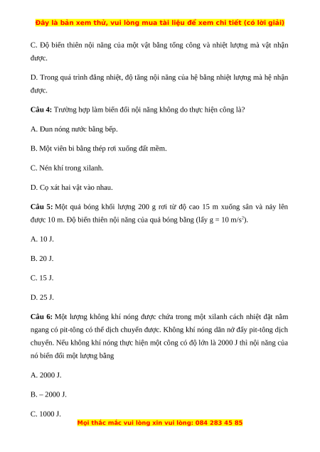 được 10 m. Độ biến thiên nội năng của quả bóng bằng (lấy g = 10 m/s2). A. 10 J. B. 20 J. C. 15 J. D. 25 J.