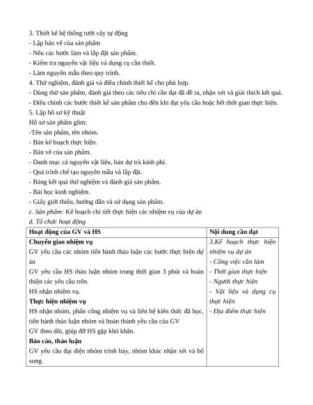 c. Sản phẩm: Báo cáo hồ sơ kỹ thuật hệ thống tưới cây tự động