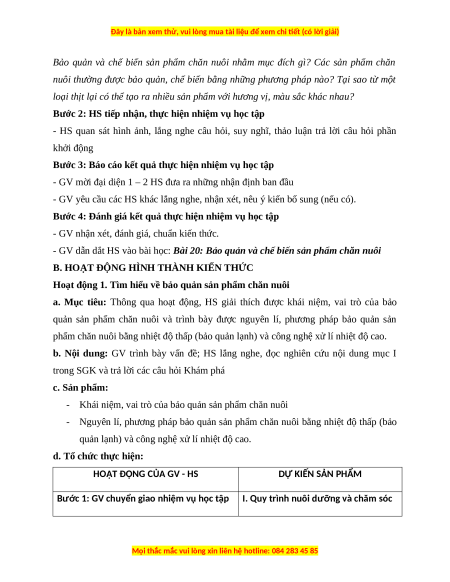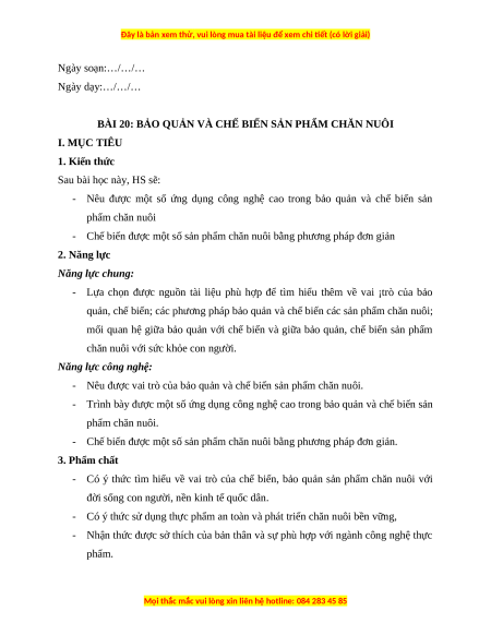 BÀI 20: BẢO QUẢN VÀ CHẾ BIẾN SẢN PHẨM CHĂN NUÔI I. MỤC TIÊU 1. Kiến thức Sau bài học này, HS sẽ: