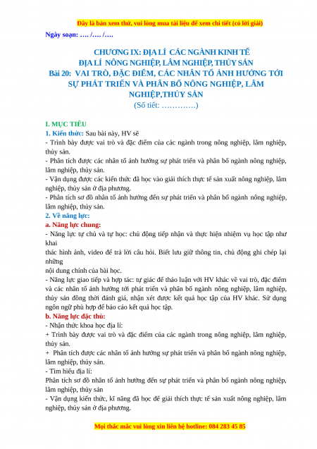 Giáo án Bài 20 Địa lí 10 Cánh Diều (2024): Vai trò, đặc điểm, các nhân tố ảnh hưởng tới sự phát triển và phân bố nông nghiệp, lâm nghiệp, thủy sản