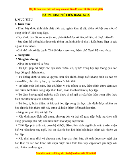 BÀI 20. KINH TẾ LIÊN BANG NGA I. MỤC TIÊU 1. Kiến thức: