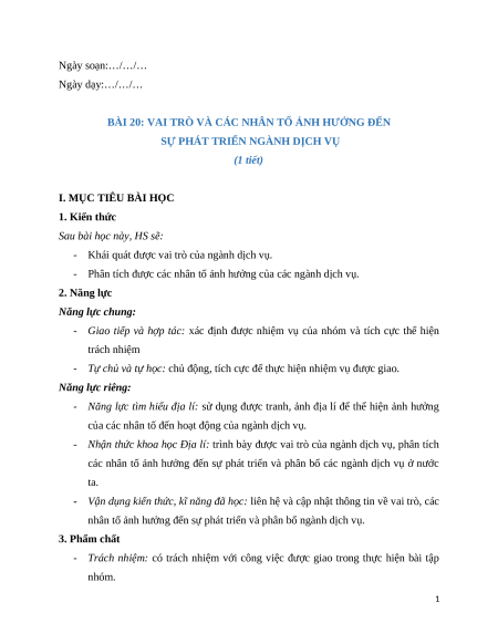 - Phân tích được các nhân tố ảnh hưởng của các ngành dịch vụ. 2. Năng lực