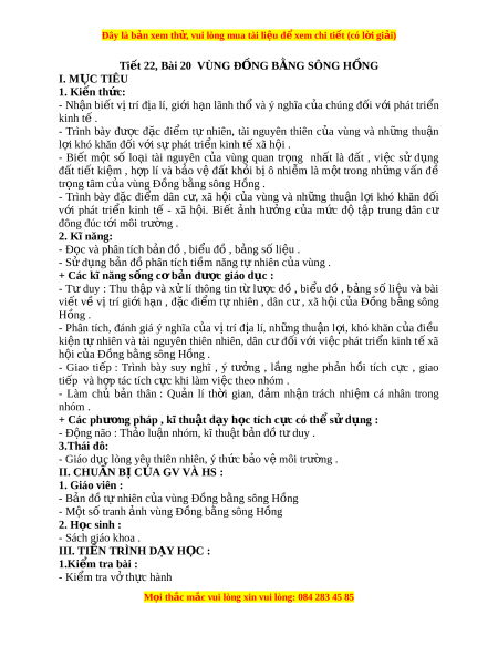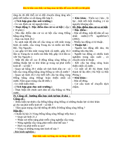 ể tự nhiên, tài nguyên thiên c a ủ vùng và nh ng ữ thu n ậ l i ợ khó khăn đối v i ớ sự phát tri n ể kinh t xã h ế i ộ . - Bi t ế m t ộ số lo i ạ tài nguyên c a ủ vùng quan tr ng ọ nh t ấ là đ t ấ , vi c ệ sử d ng ụ đất ti t ế ki m ệ , h p ợ lí và b o ả v ệ đ t ấ kh i ỏ b ịô nhi m ễ là m t ộ trong nh ng ữ v n ấ đề tr ng t ọ âm c a ủ vùng Đồng b ng ằ sông Hồng . - Trình bày đ c ặ đi m ể dân c , ư xã h i ộ c a ủ vùng và nh ng ữ thu n ậ l i ợ khó khăn đ i ố v i ớ phát tri n ể kinh tế - xã h i ộ . Bi t ế nh ả hư ng ở c a ủ m c ứ độ t p ậ trung dân cư đông đúc t i ớ môi trư ng . ờ 2. Kĩ năng: - Đ c và ọ phân tích b n đ ả , bi ồ u đ ể , b ồ ng s ả l ố i u . ệ - S d ử ng b ụ n ả đồ phân tích ti m