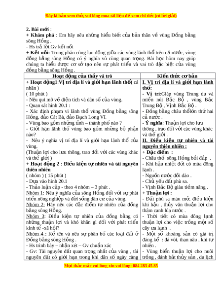 ề năng tự nhiên c a vùng . ủ + Các kĩ năng s ng c ố b ơ n đ ả ư c ợ giáo d c ụ : - Tư duy : Thu th p ậ và xử lí thông tin t ừ lư c ợ đ ồ , bi u ể đ ồ , b ng ả s ố li u ệ và bài vi t ế về vị trí gi i ớ h n ạ , đ c ặ đi m ể t ự nhiên , dân c ư , xã h i ộ c a ủ Đ ng ồ b ng ằ sông Hồng .