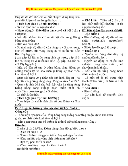 ấ cả + Khó khăn : nư c.T ớ ầm quan tr ng c ọ a đê ủ đi u ) ề - Dân số đông. - Gv chốt ki n t ế h c . ứ - Cơ c u ấ kinh tế chuy n ể d ch ị - ( Tích h p gi ợ áo d c m ụ ôi trư ng ) ờ ch m ậ . - Th c ự hi n ệ t t ố chính sách dân số c a ủ Đ ng ả và Nhà nư c. ớ IV. C ng c ủ - ố hư ng ớ d n h ẫ c s ọ inh t h ự c ọ n ở hà : Củng cố : - Đi u ki ề n t ệ nhi ự ên c a Đ ủ ồng b ng ằ sông Hồng có nh ng t ữ hu n ậ l i ợ và khó khăn gì cho s phát ự tri n ki ể nh t – xã h ế i ộ ? - Tầm quan tr ng c ọ a ủ h t ệ hống đê đi u ề Đ ở ng b ồ ng s ằ ông H ng ? ồ Dặn dò : - Chuẩn b bài ị 21:Vùng Đồng b ng s ằ ông Hồng( ti p t ế heo ) + Quan sát hình 21.2 + Nh n ậ xét ti m ề năng phát tri n ể công nghi p c ệ a vùng . ủ + Nông nghi p c ệ a ủ vùng phát tri n nh ể t ư h nào ế ? + Dịch v phát ụ tri n r ể a sao? + Vùng có nh ng t ữ rung tâm kinh t nào ? ế - R út kinh nghi m ệ : M i ọ thắc m c
