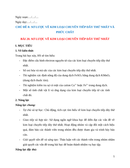 BÀI 20. SƠ LƯỢC VỀ KIM LOẠI CHUYỂN TIẾP DÃY THỨ NHẤT I. MỤC TIÊU 1. Về kiến thức