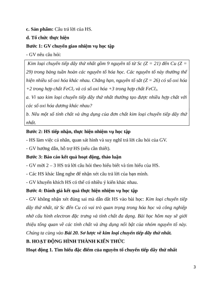 c. Sản phẩm: Câu trả lời của HS về đặc điểm của nguyên tố chuyển tiếp dãy thứ nhất.