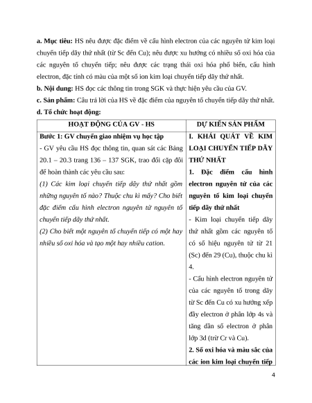 Giáo án Bài 20 Hóa học 12 Cánh Diều: Sơ lược về kim lại chuyển tiếp dãy thứ nhất