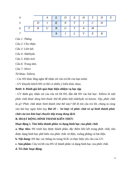 Giáo án Bài 20 Hóa học 12 Chân trời sáng tạo: Sơ lược về phức chất và sự hình thành phức chất của ion kim loại chuyển tiếp trong dung dịch