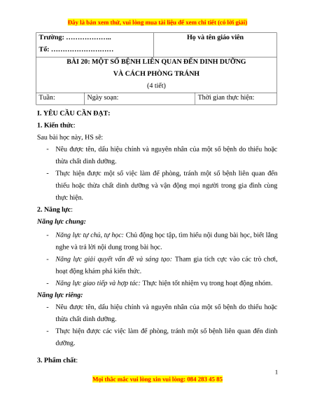 BÀI 20: MỘT SỐ BỆNH LIÊN QUAN ĐẾN DINH DƯỠNG VÀ CÁCH PHÒNG TRÁNH (4 tiết) Tuần: Ngày soạn: Thời gian thực hiện: